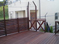 寸法:L:6200 D:2960 H:2400 床:ウエスタンウリン材デッキ 色:ブラウン 手すり: ウリン材(横ストライプタイプ)色:ブラウン オプション:ペット用ネコネット柱取り付け フェンスルーバータイプは 人工木材(人工合成素材)もあります